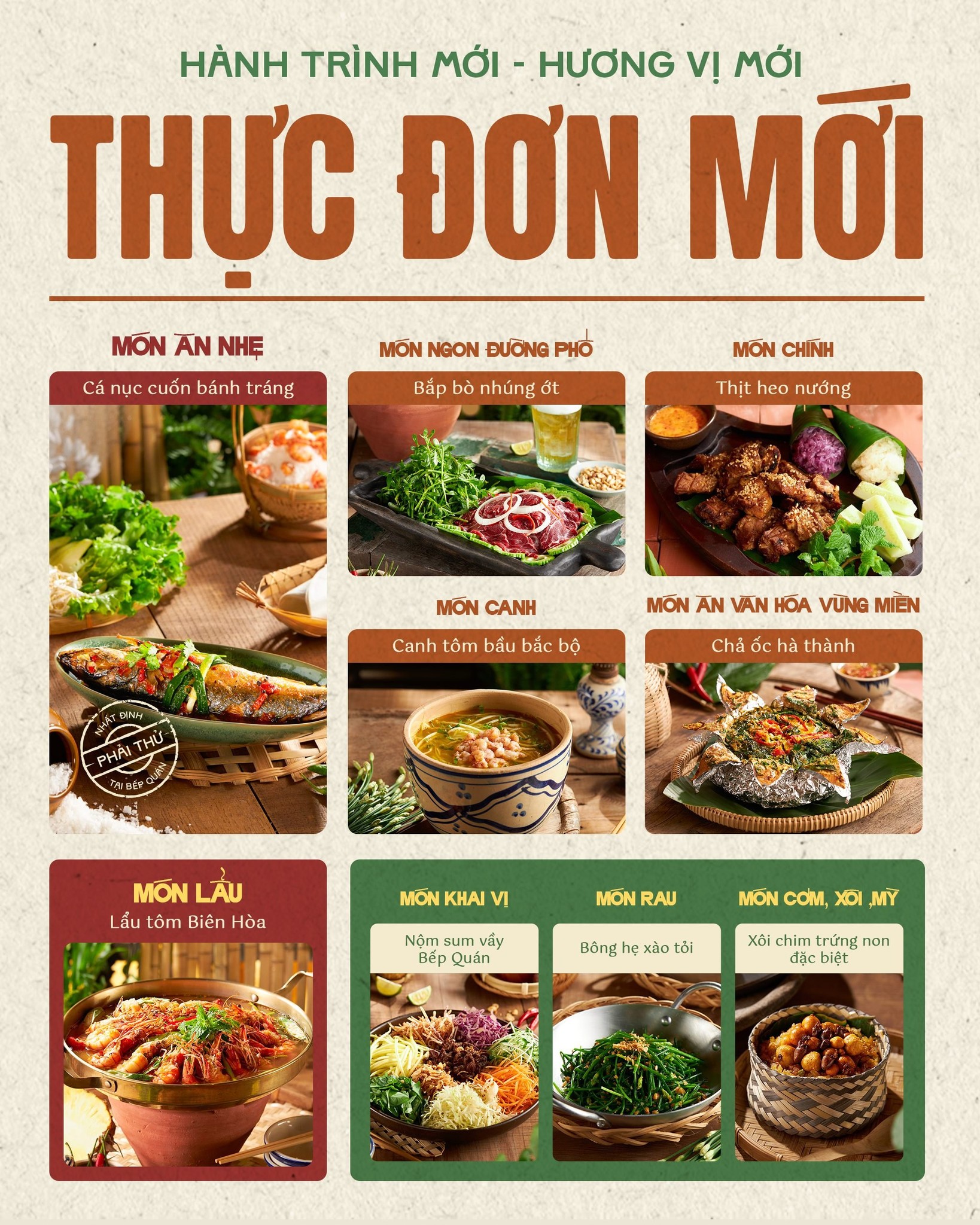 MÓN CHÍNH: Thêm một sự lựa chọn cho những “bữa cơm nhà”, Bếp giới thiệu đến bạn món Thịt heo nướng kiểu Bếp Quán đậm đà thơm lừng, Chim câu quay vị bếp đầy dinh dưỡng, Cá thỏ biển Phú Quốc nướng muối ớt đậm vị.